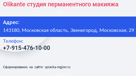 Olikante, студия перманентного макияжа по адресу 143180, Московская область, Звенигород, Московская, 29 в дальнейшем Организация, размещена в следующих категориях:
