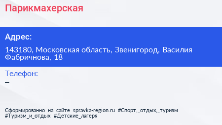 Парикмахерская по адресу 143180, Московская область, Звенигород, Василия Фабричнова, 18 в дальнейшем Организация, размещена в следующих категориях: