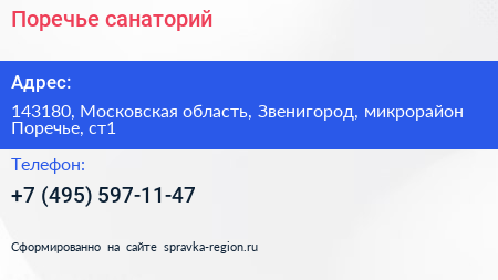 Поречье, санаторий по адресу 143180, Московская область, Звенигород, микрорайон Поречье, ст1 в дальнейшем Организация, размещена в следующих категориях: