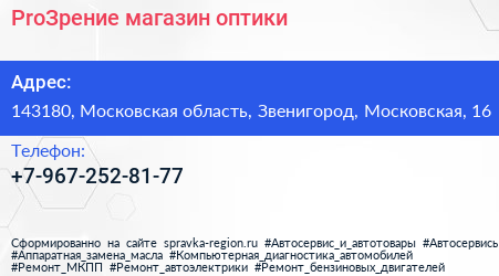 ProЗрение, магазин оптики по адресу 143180, Московская область, Звенигород, Московская, 16 в дальнейшем Организация, размещена в следующих категориях: