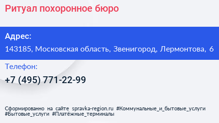Ритуал, похоронное бюро по адресу 143185, Московская область, Звенигород, Лермонтова, 6 в дальнейшем Организация, размещена в следующих категориях: