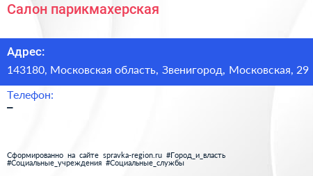 Салон-парикмахерская по адресу 143180, Московская область, Звенигород, Московская, 29 в дальнейшем Организация, размещена в следующих категориях: