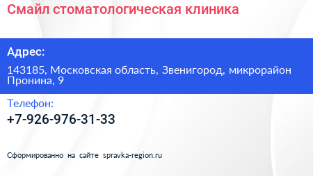 Смайл, стоматологическая клиника по адресу 143185, Московская область, Звенигород, микрорайон Пронина, 9 в дальнейшем Организация, размещена в следующих категориях: