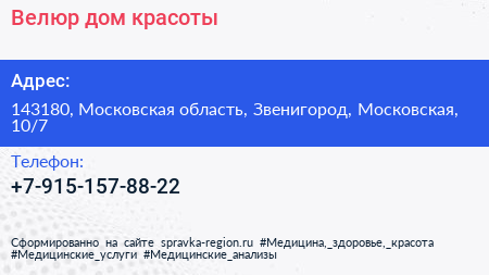 Велюр, дом красоты по адресу 143180, Московская область, Звенигород, Московская, 10/7 в дальнейшем Организация, размещена в следующих категориях: