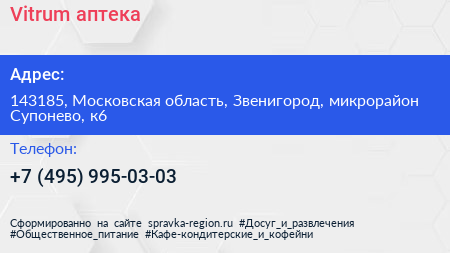 Vitrum, аптека по адресу 143185, Московская область, Звенигород, микрорайон Супонево, к6 в дальнейшем Организация, размещена в следующих категориях: