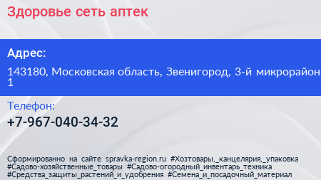 Здоровье, сеть аптек по адресу 143180, Московская область, Звенигород, 3-й микрорайон, 1 в дальнейшем Организация, размещена в следующих категориях: