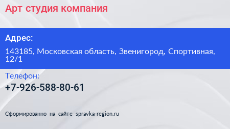 Арт студия, компания по адресу 143185, Московская область, Звенигород, Спортивная, 12/1 в дальнейшем Организация, размещена в следующих категориях:
