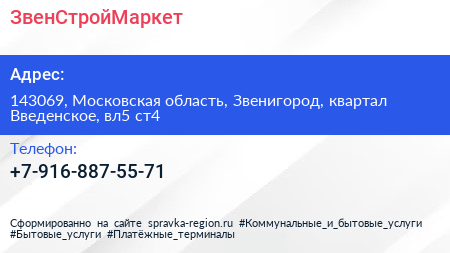 ЗвенСтройМаркет по адресу 143069, Московская область, Звенигород, квартал Введенское, вл5 ст4 в дальнейшем Организация, размещена в следующих категориях: