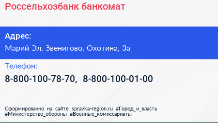 Россельхозбанк, банкомат по адресу Марий Эл, Звенигово, Охотина, 3а в дальнейшем Организация, размещена в следующих категориях: