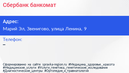 Сбербанк, банкомат по адресу Марий Эл, Звенигово, улица Ленина, 9 в дальнейшем Организация, размещена в следующих категориях: