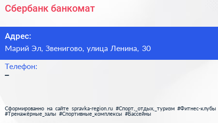 Сбербанк, банкомат по адресу Марий Эл, Звенигово, улица Ленина, 30 в дальнейшем Организация, размещена в следующих категориях:
