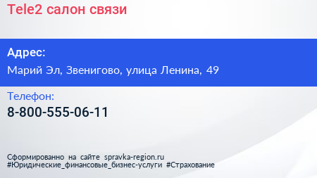 Tele2, салон связи по адресу Марий Эл, Звенигово, улица Ленина, 49 в дальнейшем Организация, размещена в следующих категориях: