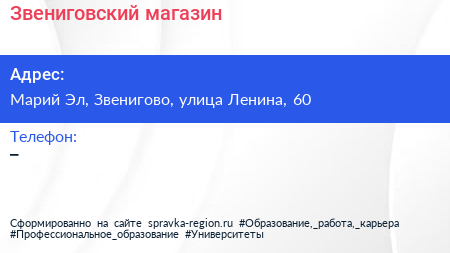 Звениговский, магазин по адресу Марий Эл, Звенигово, улица Ленина, 60 в дальнейшем Организация, размещена в следующих категориях:
