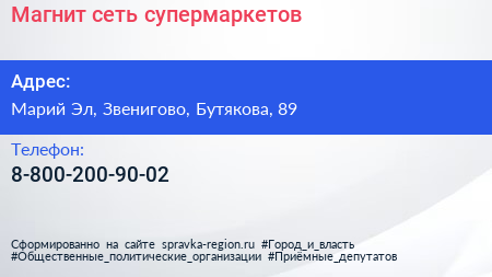 Магнит, сеть супермаркетов по адресу Марий Эл, Звенигово, Бутякова, 89 в дальнейшем Организация, размещена в следующих категориях: