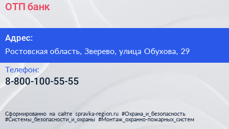 ОТП банк по адресу Ростовская область, Зверево, улица Обухова, 29 в дальнейшем Организация, размещена в следующих категориях: