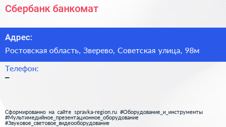 Сбербанк, банкомат по адресу Ростовская область, Зверево, Советская улица, 98м в дальнейшем Организация, размещена в следующих категориях: