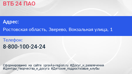 ВТБ 24, ПАО по адресу Ростовская область, Зверево, Вокзальная улица, 1 в дальнейшем Организация, размещена в следующих категориях: