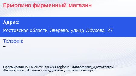 Ермолино, фирменный магазин по адресу Ростовская область, Зверево, улица Обухова, 27 в дальнейшем Организация, размещена в следующих категориях: