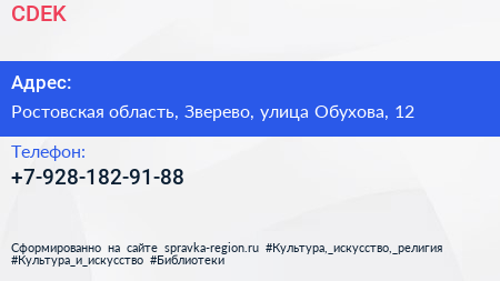 CDEK по адресу Ростовская область, Зверево, улица Обухова, 12 в дальнейшем Организация, размещена в следующих категориях:
