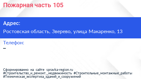 Пожарная часть №105 по адресу Ростовская область, Зверево, улица Макаренко, 13 в дальнейшем Организация, размещена в следующих категориях: