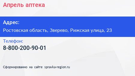 Апрель, аптека по адресу Ростовская область, Зверево, Рижская улица, 23 в дальнейшем Организация, размещена в следующих категориях: